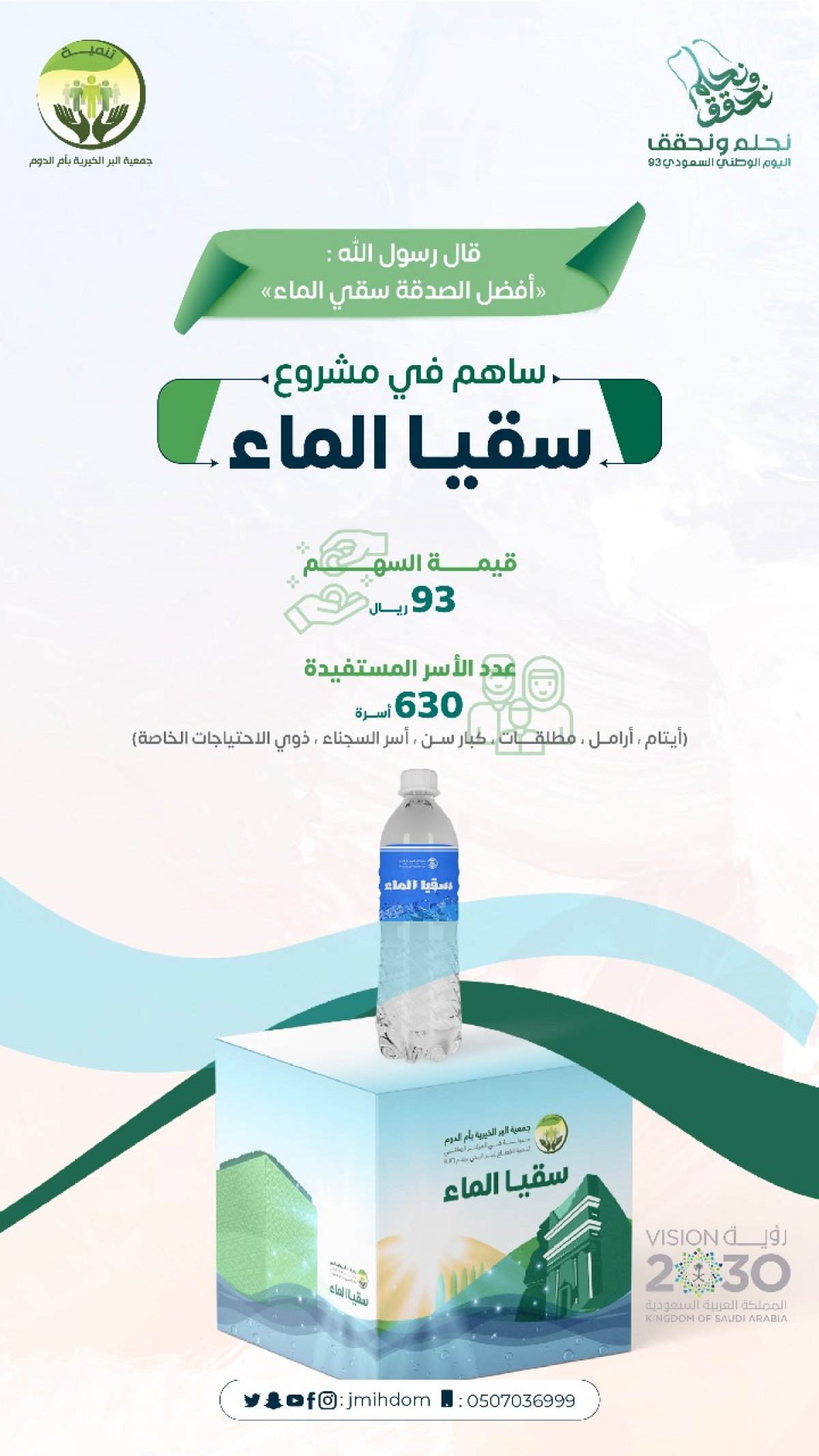 ساهم معنا في مشروع سقيا عدد630 اسرة من الايتام والارامل والمطلقات وكبار السن وذي الاحتياجات الخاصة واسر السجناء